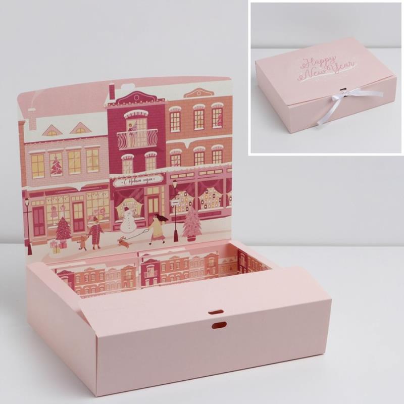 Коробка подарочная новогодняя прямоугольная 31х24х8см складная двусторонняя 'Розовый новый год'