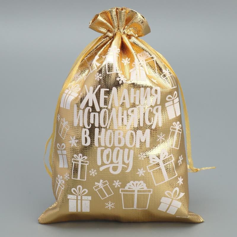 Мешок подарочный новогодний 16х24см парча 'Желания исполняются' золотой