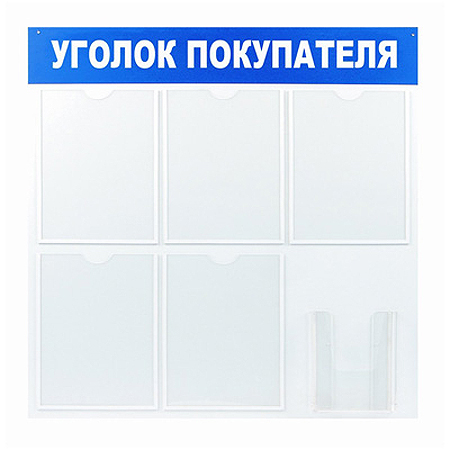 Стенд изготовлен из пятимиллиметрового ПВХ матово-белого цвета. Конструкция оснащена пятью карманами для листов формата А4 и одним отделением для А5. Карманы изготовлены из прозрачного акрилового оргстекла, разделители — из белого пористого самоклеящегося материала. Оборудование поставляется со всем необходимым крепежом.