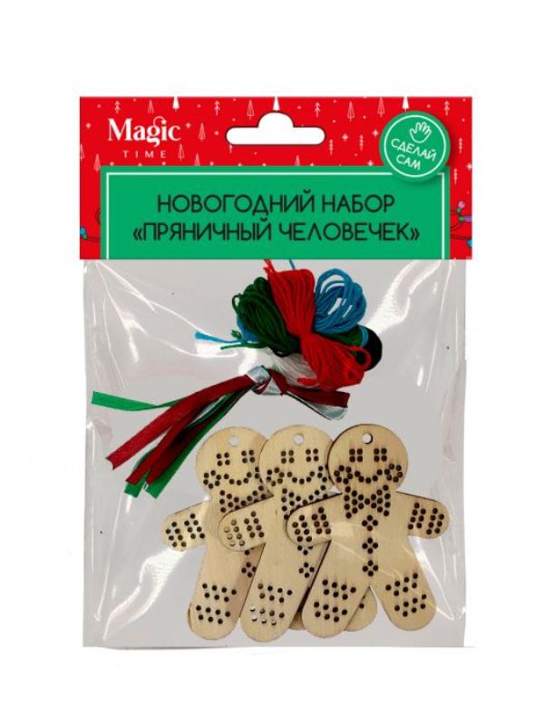 Новогодний набор Пряничный человечек, для изготовления новогоднего украшения. Заготовки древесина тополя 3шт, игла (полипропилен) 1 штука, лента длина - 30см, 5шт, веревка 5 цветов длиной - 200см, 5шт, инструкция в наборе.