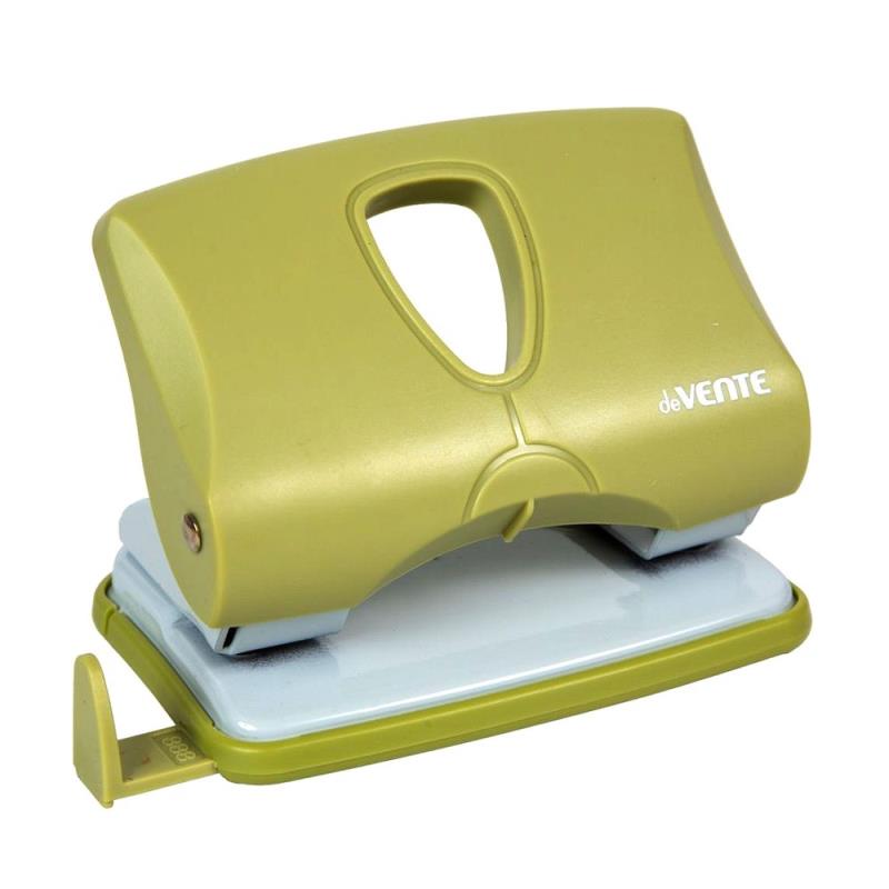 Дырокол с пластиковым корпусом, линейкой и съемным поддоном для конфетти.