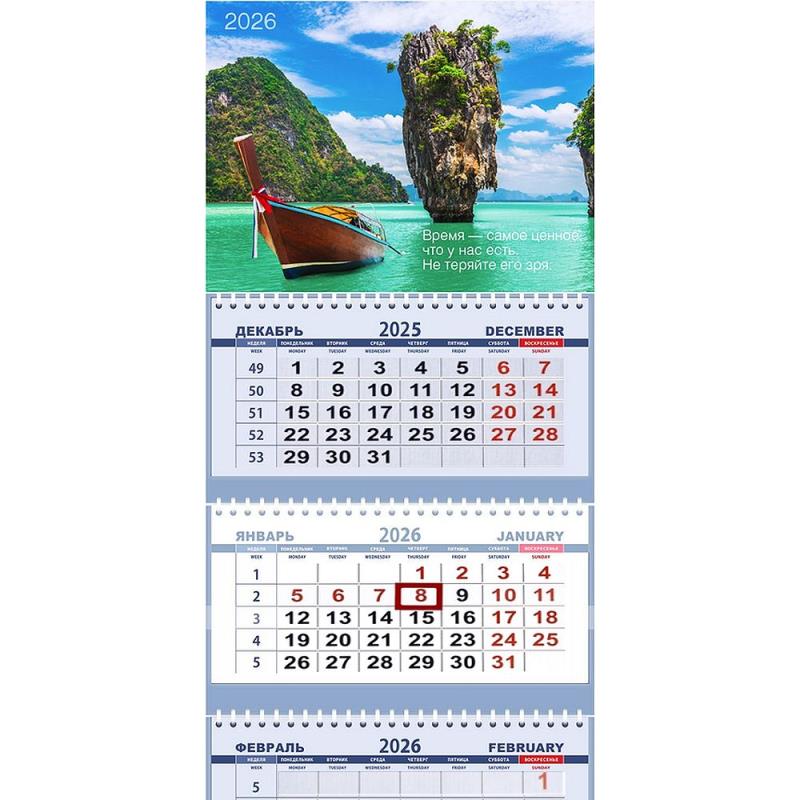 Календарь состоит из красочного постера и трех блоков. Каждый блок включает 12 листов офсетной бумаги закрепленных на металлическом гребне.
