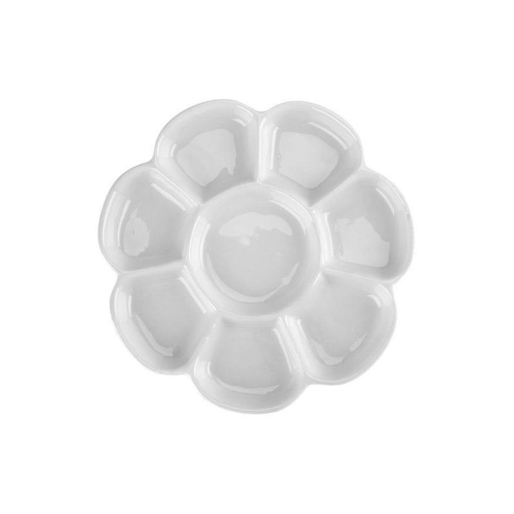 Палитра 'Сонет' фарфоровая, круглая. Восемь ячеек, сложенных в единую форму диаметром 17 см. Внешне напоминает цветок, который идеально дополнит интерьер рабочего пространства художника. Подойдет для любого типа красок: масляных, акрила, акварели и других, а также для изготовления пигментов, различных красителей, смесей и химических составов.