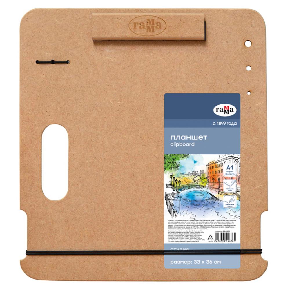 Планшет-клипборд ГАММА серии «Студия» для живописи на пленэрах и вне студии — легкий, тонкий, но прочный. Подходит для бумаги формата А4. Изготовлен из МДФ. Магнитный зажим и резинка надежно фиксируют лист, не оставляя заломов. Гладкая поверхность не повредит даже тонкую бумагу. Держатели для карандашей и отверстия для кистей позволяют организовать рабочее место. Есть вырубная ручка для удобной транспортировки. Планшет можно установить на мольберт-треногу или этюдник.
