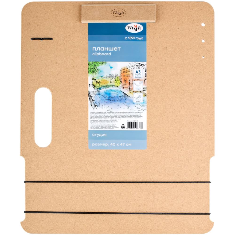 Планшет-клипборд ГАММА серии «Студия» для живописи на пленэрах и вне студии — легкий, тонкий, но прочный. Подходит для бумаги форматов от А4 до А3. Изготовлен из МДФ. Магнитный зажим и резинка надежно фиксируют лист, не оставляя заломов. Гладкая поверхность не повредит даже тонкую бумагу. Держатели для карандашей и отверстия для кистей позволяют организовать рабочее место. Есть вырубная ручка для удобной транспортировки. Планшет можно установить на мольберт-треногу или этюдник.