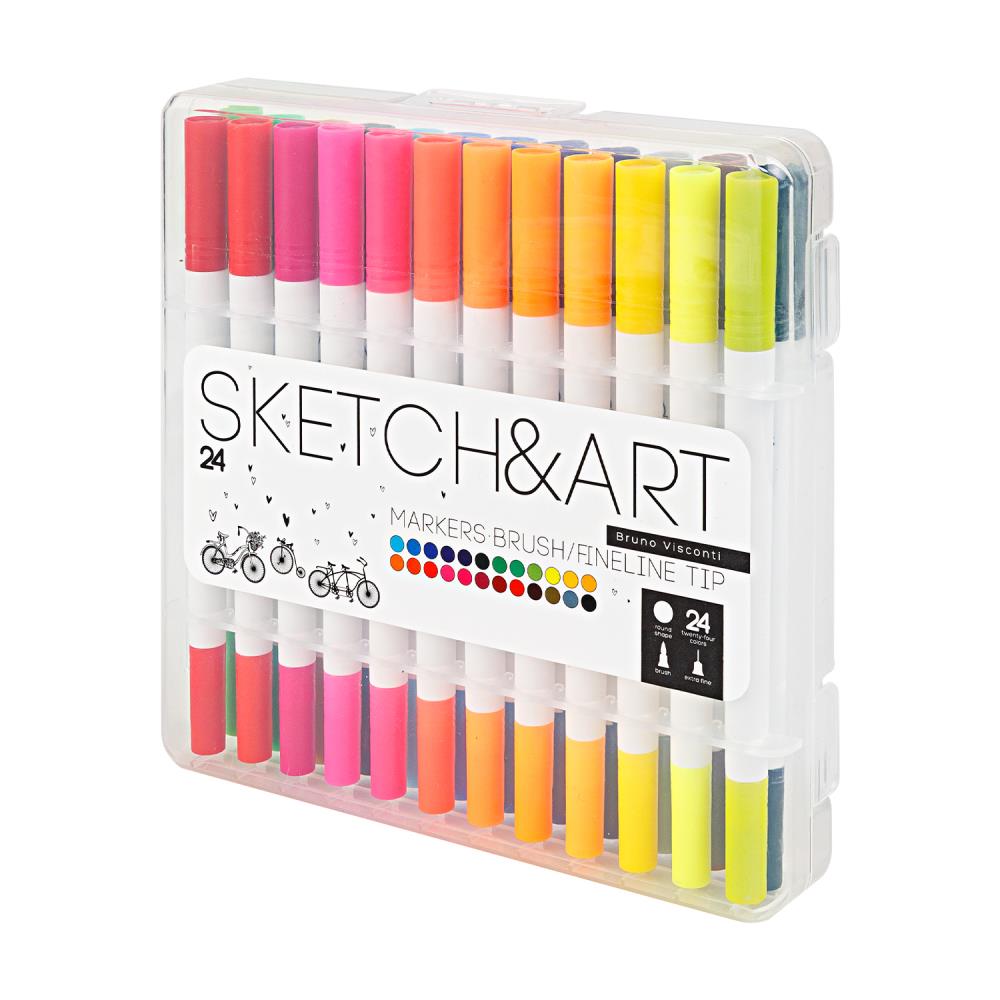 Набор двусторонних маркеров «Sketch&Art» – это 24 маркера различных цветов и безграничные возможности для творчества. Маркер снабжен двумя видам наконечника: капиллярный и кисть, позволяющих рисовать в различных техниках. Линер из износостойкого волокна, с шириной линии 1мм – универсальный для скетчинга инструмент, с помощью которого наносят контуры под маркеры или акварель, делают записи и наброски. Он дает четкий штрих и равномерную тонкую линию. Гибкий, легко принимающий прежнюю форму наконечник-кисть создает линии различной ширины – от 1 до 3 мм в зависимости от угла и силы нажатия. Маркер заправлен быстросохнущими, светостойкими, нетоксичными чернилами на водной основе. Колпачки плотно защелкиваются, обеспечивая долгую сохранность чернил от высыхания. Высококачественные профессиональные маркеры «Sketch&Art» - идеальный инструмент для рисования, набросков, дизайнерских работ.