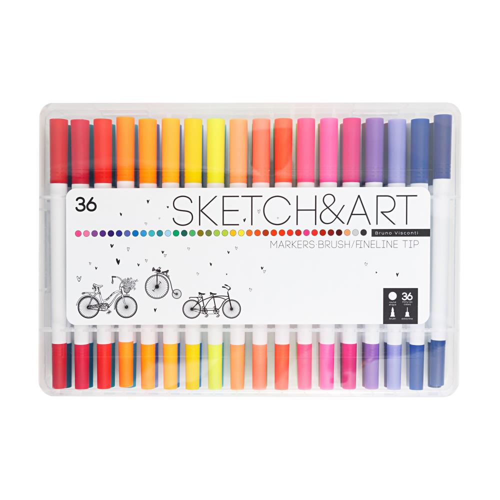 Набор двусторонних маркеров «Sketch&Art» – это 36 маркеров различных цветов и безграничные возможности для творчества. Маркер снабжен двумя видам наконечника: капиллярный и кисть, позволяющих рисовать в различных техниках. Линер из износостойкого волокна, с шириной линии 1мм – универсальный для скетчинга инструмент, с помощью которого наносят контуры под маркеры или акварель, делают записи и наброски. Он дает четкий штрих и равномерную тонкую линию. Гибкий, легко принимающий прежнюю форму наконечник-кисть создает линии различной ширины – от 1 до 3 мм в зависимости от угла и силы нажатия. Маркер заправлен быстросохнущими, светостойкими, нетоксичными чернилами на водной основе. Колпачки плотно защелкиваются, обеспечивая долгую сохранность чернил от высыхания. Высококачественные профессиональные маркеры «Sketch&Art» - идеальный инструмент для рисования, набросков, дизайнерских работ.