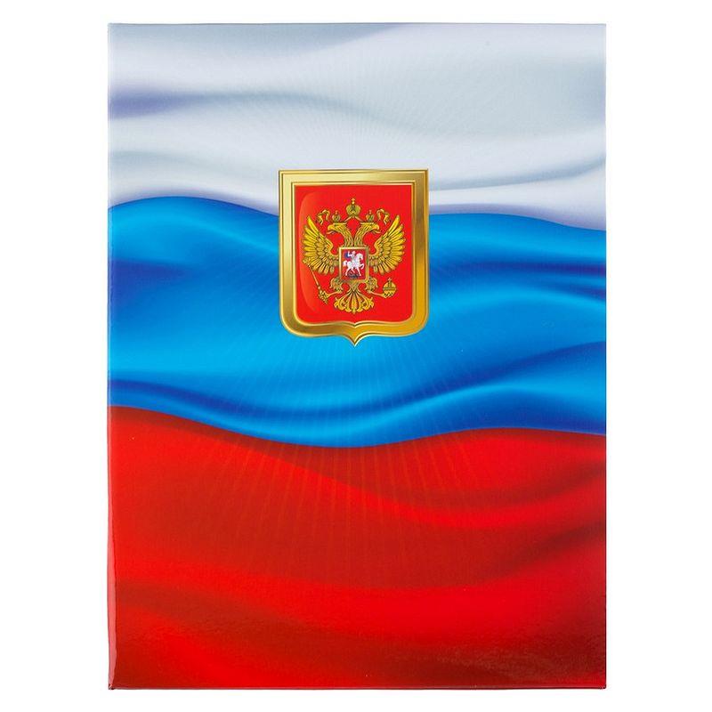 Адресная папка формата А4 выполнена из плотного ламинированного картона. На обложке изображена государственная символика России — триколор и герб.