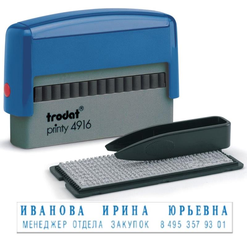 Штамп представляет собой надежный пластиковый корпус с пружинным механизмом, встроенной сменной подушкой синего цвета и рифленой текстовой площадкой, на которой набирается текст. Окрашенный оттиск получается автоматически при нажатии на корпус.