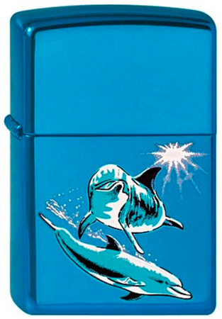 Зажигалка Zippo имеет металлический прямоугольный корпус с подпружиненной крышкой на петельке, такой, что крышку можно открыть одной рукой. Фитиль зажигалки закрыт от ветра специальными стенками с отверстиями, которые защищают пламя от боковых порывов ветра. Широкая синяя глянцевая зажигалка с нанесением оригинального дизайна.