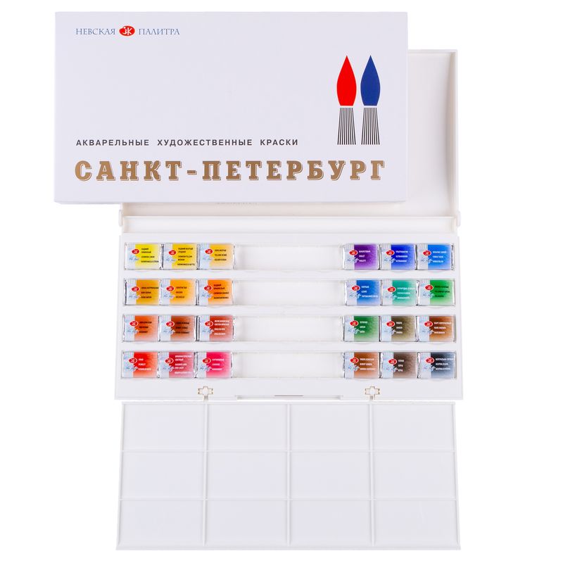 Акварельные краски, выпускаемые заводом Невская палитра, являются его визитной карточкой и признаны на международном уровне. Акварельная краска серии Белые ночи, представленная в наборе Санкт-Петербург, обладает высокой концентрацией цветового тона, сохраняющейся даже при разбавлении большим количеством воды, что обеспечивается высокой концентрацией пигмента и тонкостью его перетира. Краски превосходно смешиваются, прекрасно размываются и разносятся.