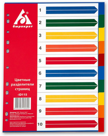 Разделители цветные 10 разделов A4 пластиковые Бюрократ с титульным листом
