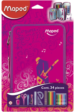 Пенал с наполнением: 12 цветных карандашей, 12 фломастеров, точилка, ножницы 13 см, линейка 15 см, угольник 60º, транспортир, циркуль, ластик, 2 простых карандаша, шариковая ручка.