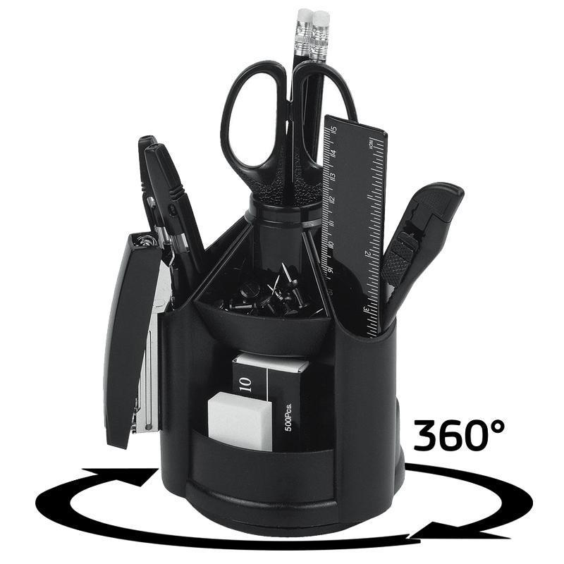 Настольный набор Attache выполнен из пластика в черном цвете. Имеет вращающуюся на 360 градусов основу. Настольный набор комплектуется 2 карандашами с ластиком, 2 ручками, канцелярским ножом, точилкой, ластиком, ножницами, линейкой, степлером №10, силовыми кнопками, скобами №10 и скрепками, подставкой.