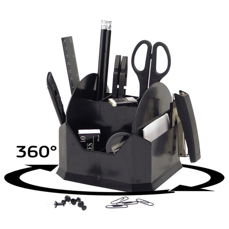 Настольный набор прямоугольной формы изготовлен из черного пластика. Имеет вращающуюся на 360 градусов основу. Настольный набор комплектуется: степлером, линейкой, точилкой, ластиком, двумя карандашами с ластиком, скрепками, силовыми кнопками, скобами для степлера, канцелярским ножом, двумя шариковыми ручками, ножницами, блоком бумаги для заметок.