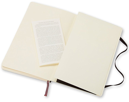 Эта записная книжка среднего формата состоит из 192 страниц в линейку, которые защищены от изнашивания при помощи мягкой обложки строгого черного цвета. Каждый Moleskine имеет придерживающую резинку, кармашек для мелочей и мягкую закладку, и эта модель записной книжки — не исключение.