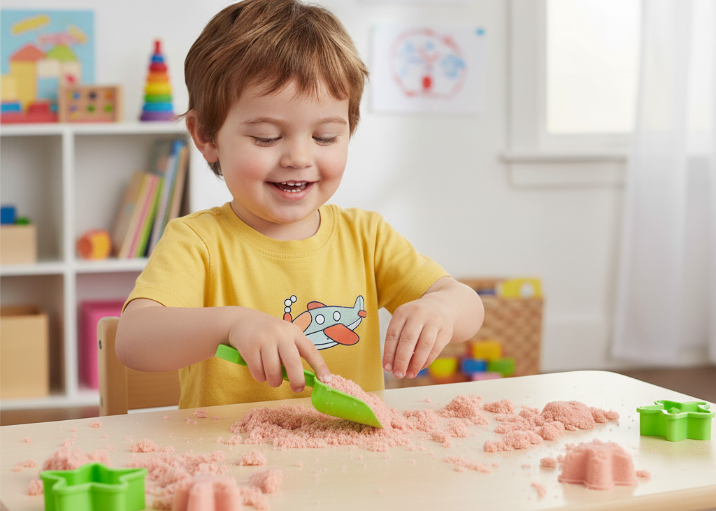 Игры с таким песком хорошо развивают мелкую моторику, тактильное восприятие и пространственное мышление. Это спокойная, почти медитативная деятельность — ребёнок сосредотачивается на форме, текстуре, движении рук.