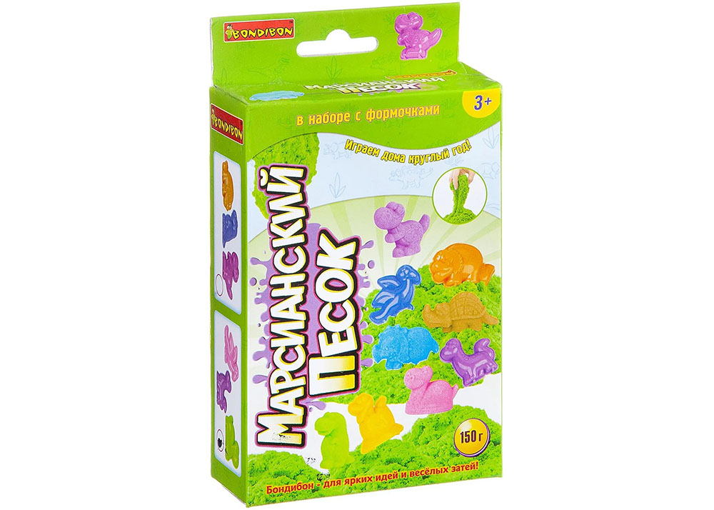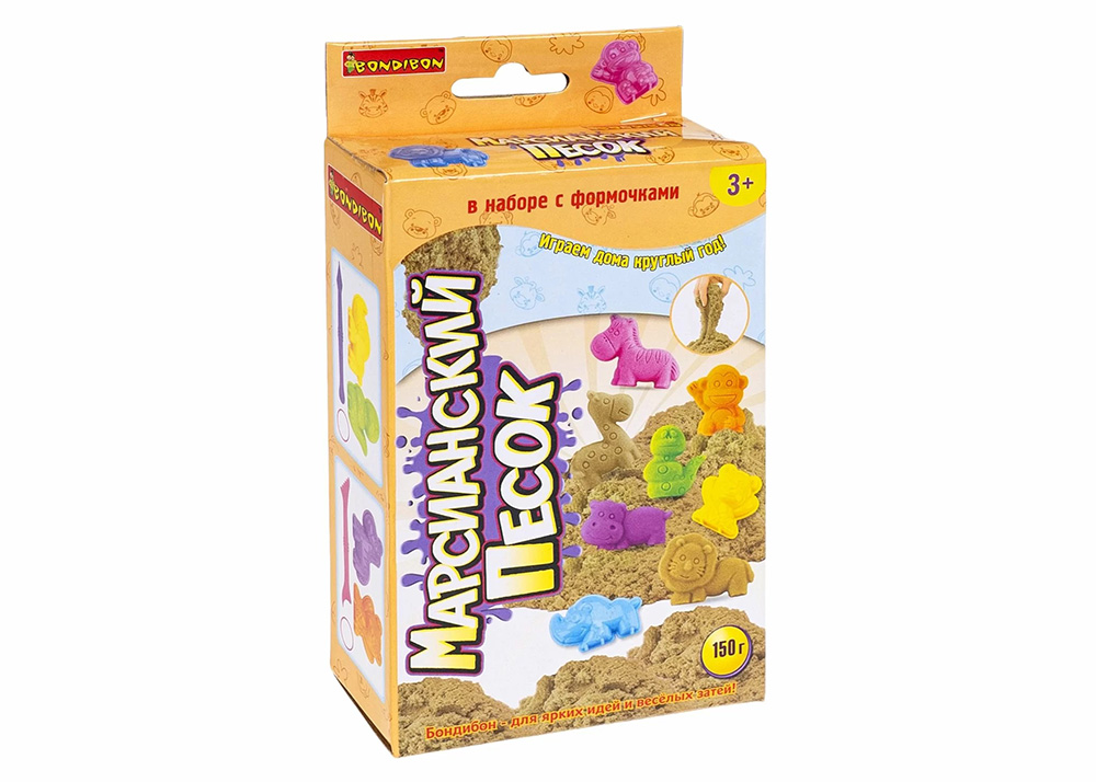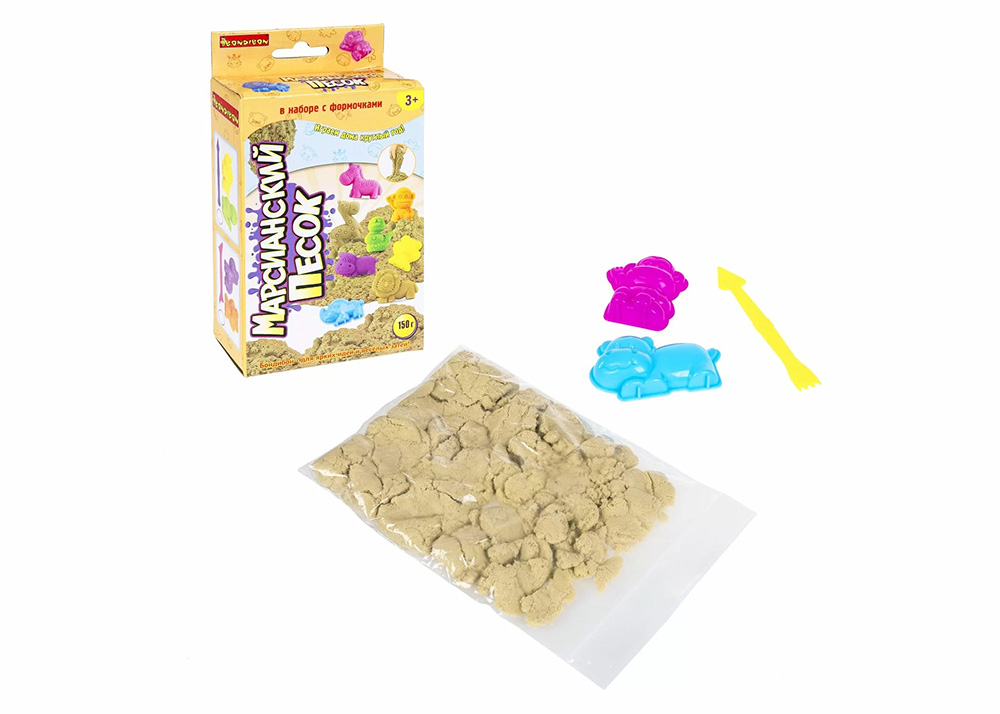 Марсианский песок от Bondibon безопасен, не сохнет и служит долго. В набор также входят стек и две формочки в виде животных — их можно использовать как отправную точку для первых поделок, а дальше подключить фантазию и лепить всё что угодно.