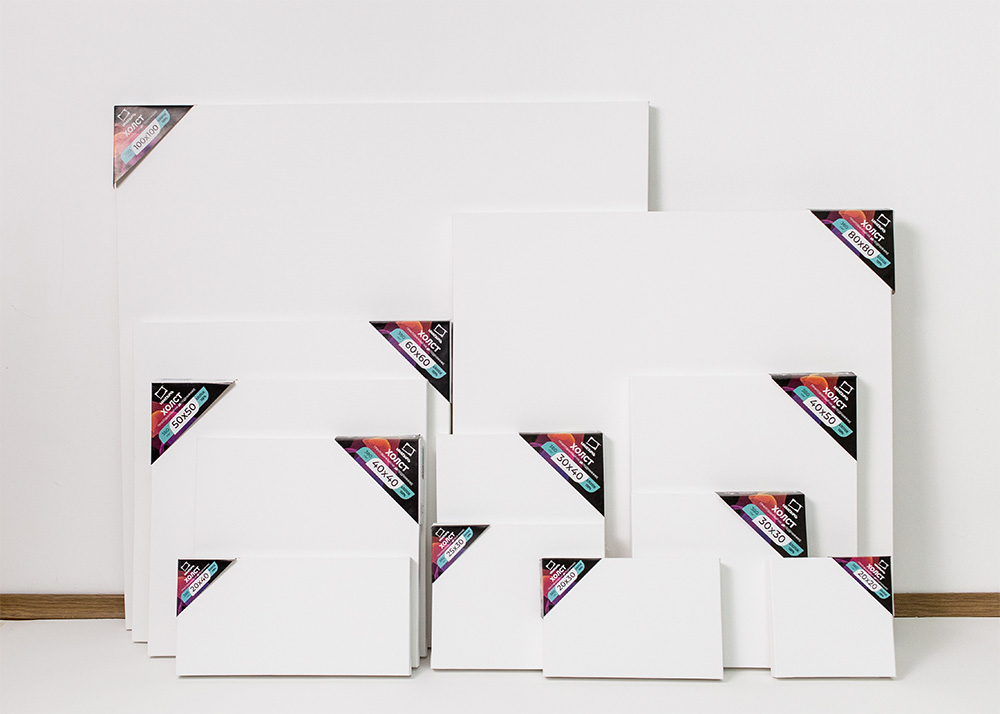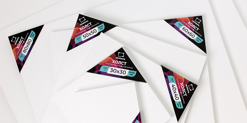 Используется натуральный хлопок с мелкозернистой фактурой. Такая поверхность подходит для детальной проработки и аккуратных мазков, при этом позволяет работать и с умеренной фактурой.